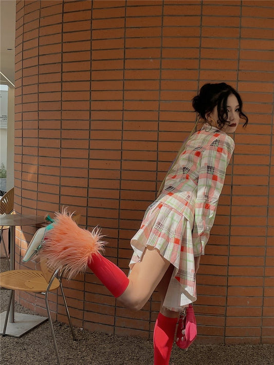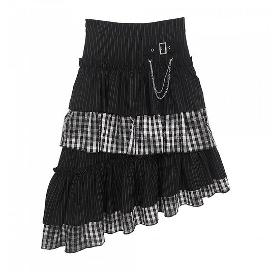 Asymmetrical Stripes Tiered Pattern Plaid Black Hem Skirt with and Y2K