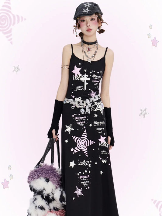 Black Y2K Stars Tea Length Cami Dress