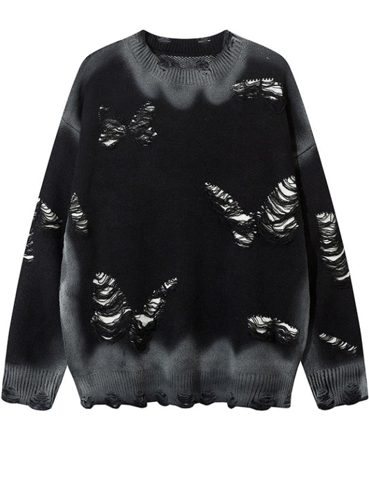 Y2K Black/Grey Butterfly Shaped Distressed Holes Round Neck Sweater