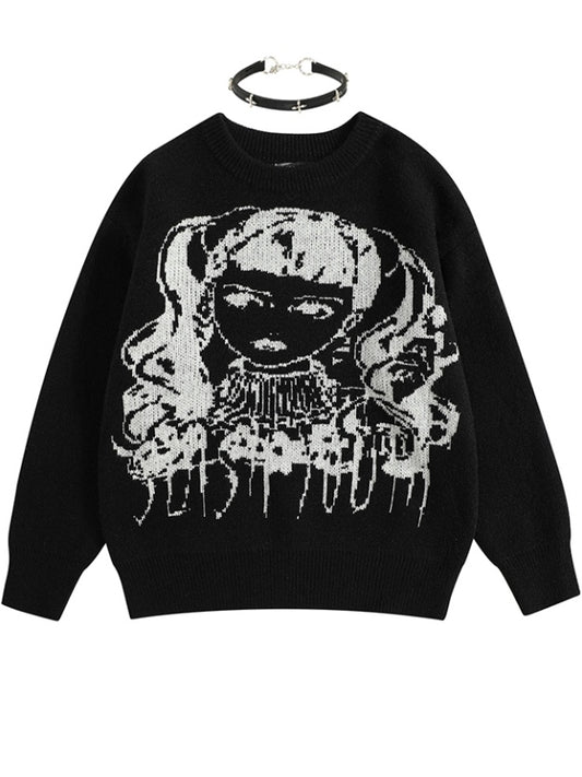 Wine Red/Black Y2K Girl Pattern Sweater with Free Choker