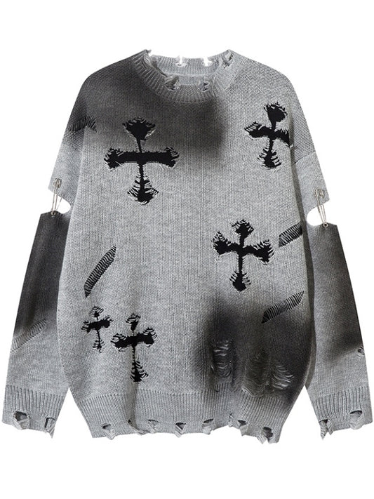 Y2K Black/Grey Cross Shaped Distressed Holes Round Neck Sweater
