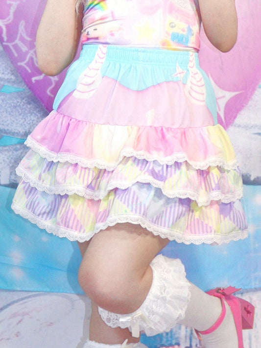 A-Line Y2K Striped Pattern White/Blue/Purple Tiered Skirt with Lace Trim