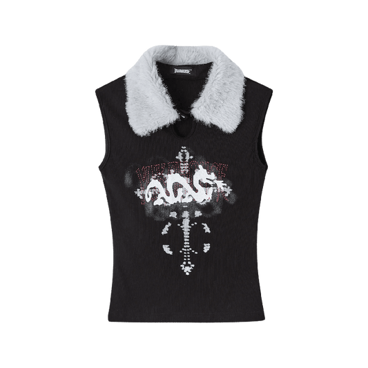 Y2K Black Plush Collar Snap Neckline Keyhole Graphic Glamorous Tank Top