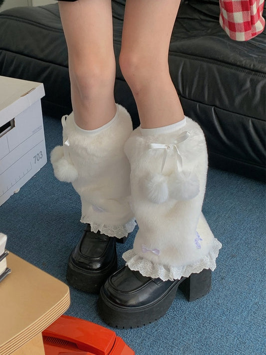 White Sweet Bowknot Lace Trim Plush Leg Warmers With Pompons