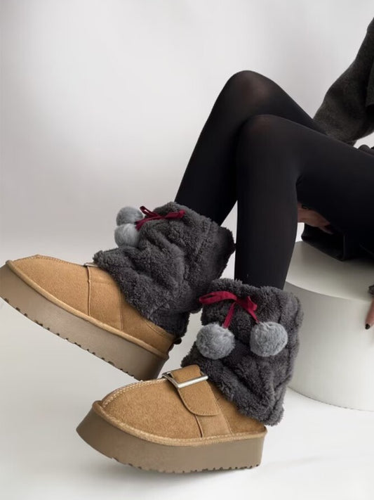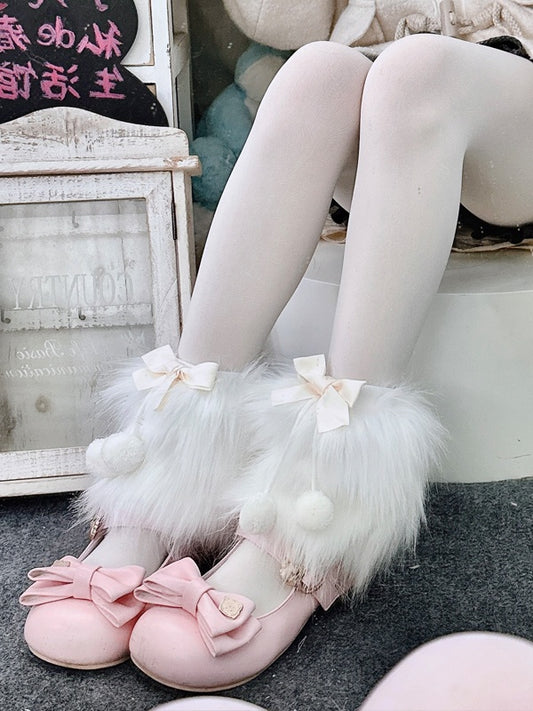 Grey Y2K Bowknot Plush Leg Warmers With Pompons