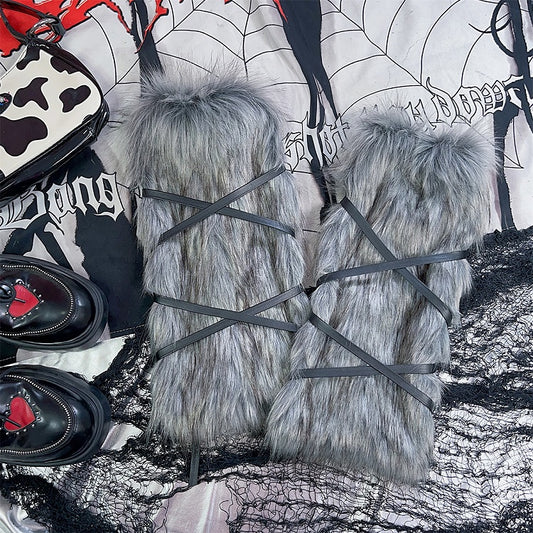 Grey Self-tie Strap Shaggy Plush Leg Warmers