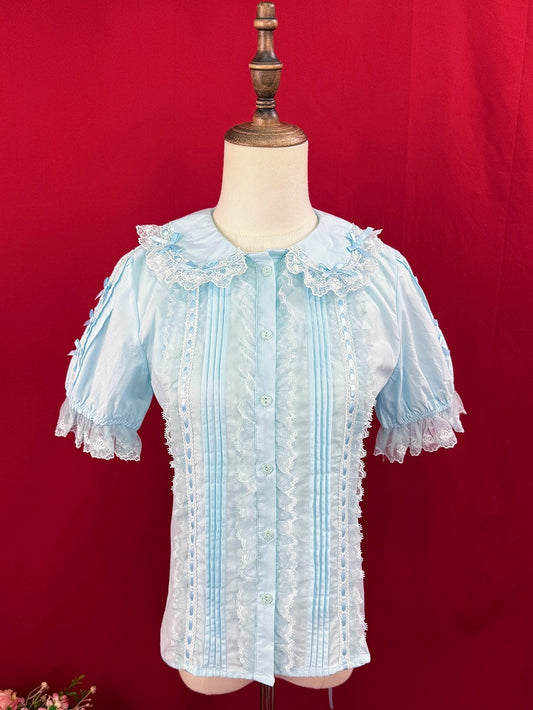 Lolita Short Blue Pan Sleeves Cotton Peter Blouse Collar Sweet