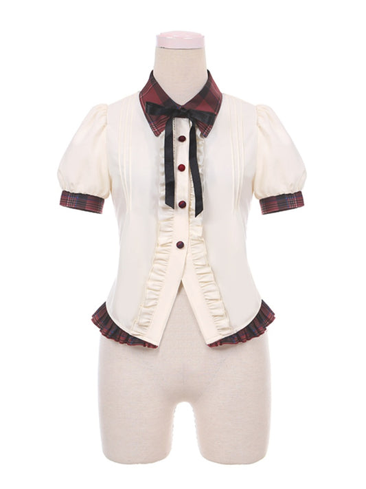 Contrast Red Plaid Trim Beige Idol Lolita Blouse with Lace-up Detail at Back