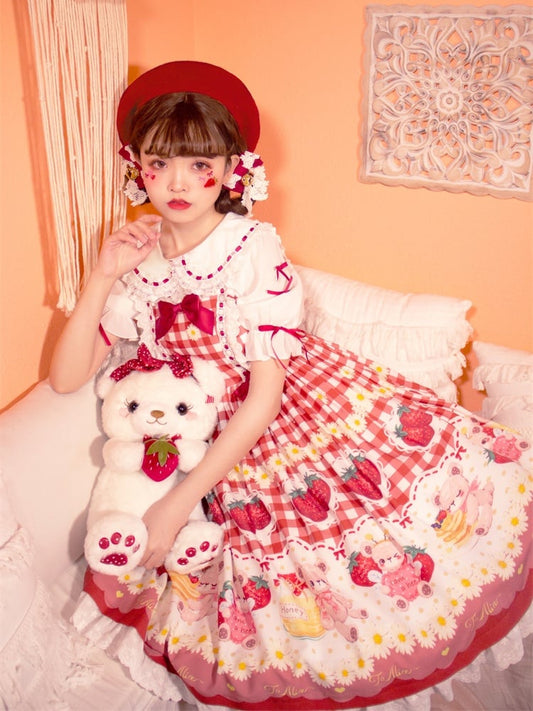 Wine Red Plaid Strawberry and Bear Print Cottagecore Country Sweet Lolita Dress Jumper Skirt