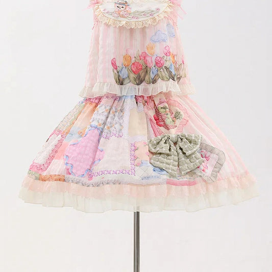 Cottagecore Patchwork Print Sweet Lolita Skirt with Detachable Straps Short Version