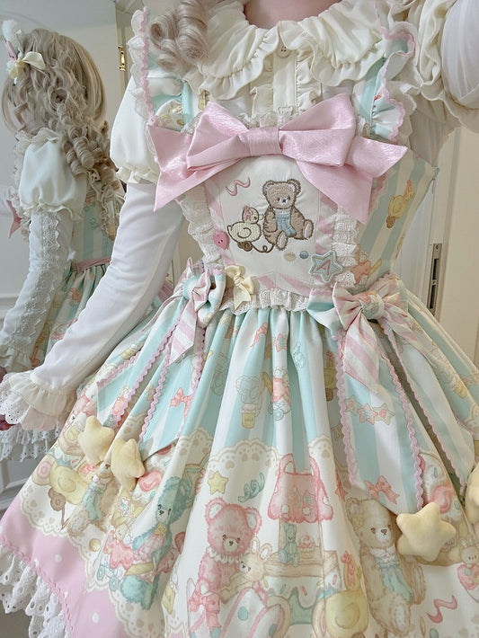 Pink and Green Teddy Print Sweet Lolita Jumper Skirt