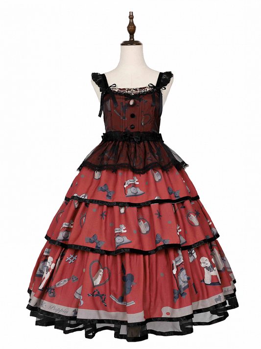 Puppy and Telephone Print Tiered Skirt Black and Red Sweet Lolita Jumper Skirt