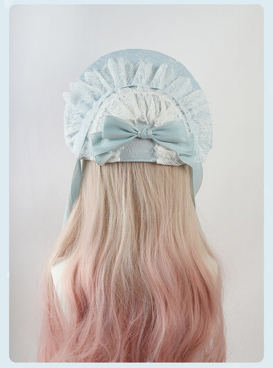 Blue Bow and Floral Ruffled Lace Trim Lolita Bonnet