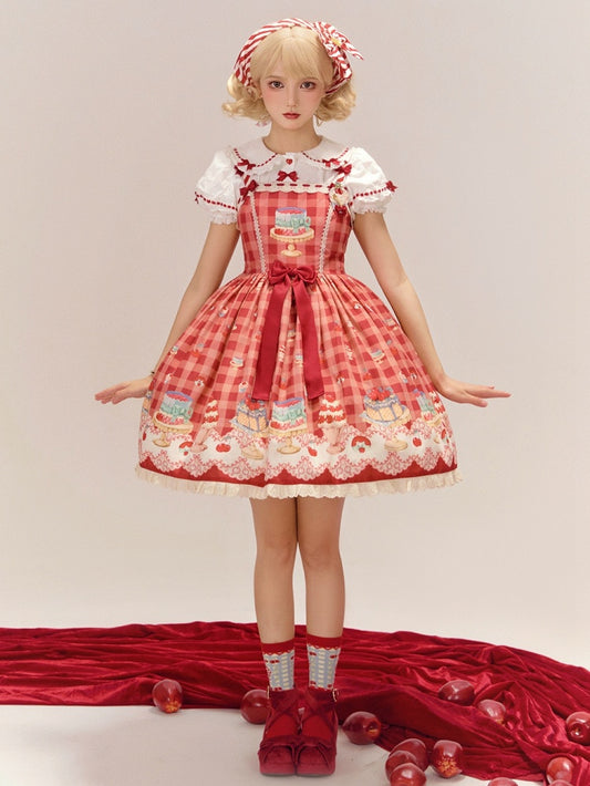 Red Gingham Pattern Cherry and Dessert Sweet Lolita Jumper Skirt