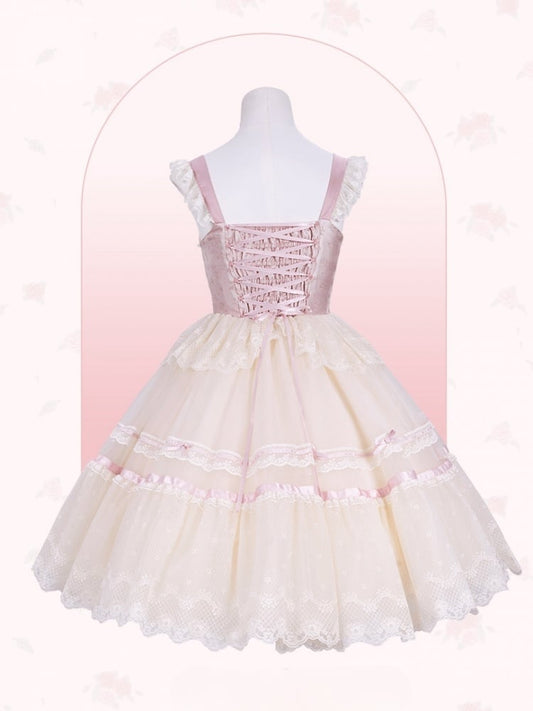 Pink Balletcore Lace Trim Heart Bodice Princess Lolita Corset Jumper Skirt