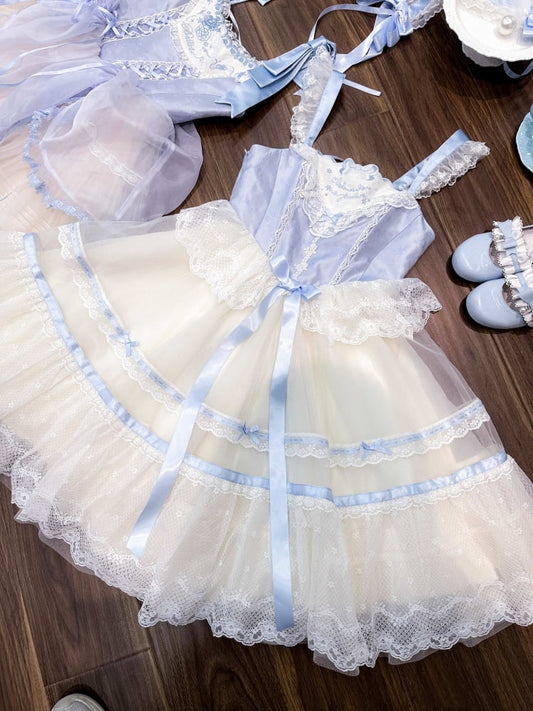 Blue Boned Waist Bowknot Embroidered Neckline Princess Lolita Jumper Skirt
