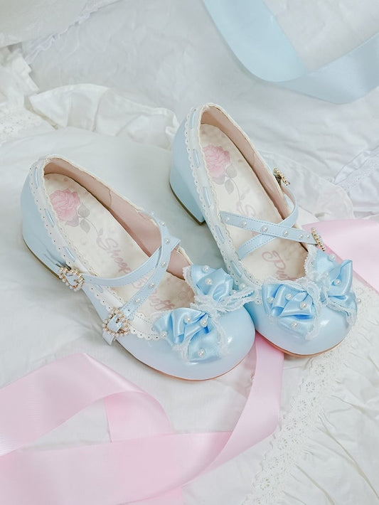 Plush Mary Bow Bear Hem Ear Blue PU Janes Decorative Low-heel Lolita in Scalloped Sweet