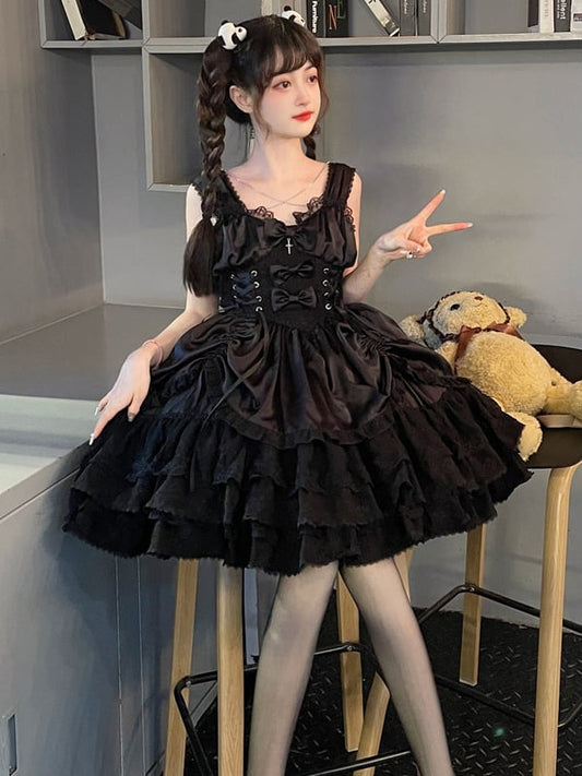 Waist Tiered Princess Black Basque Skirt Dress Drawstring Lolita with Gothic