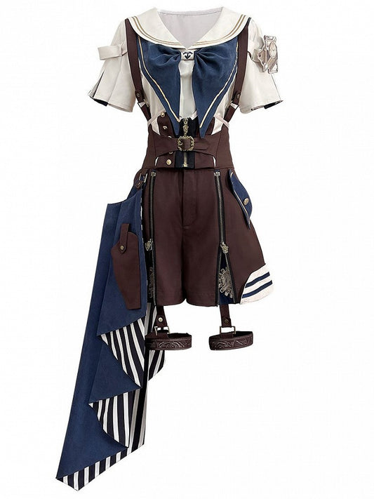 Overall Steampunk + - Blue Outfit Striped Shirt Collar Train Ouji Lolita Shorts Brown Sailor