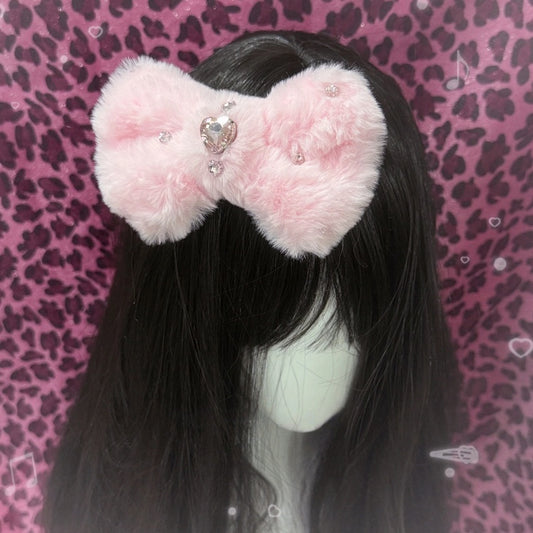 Bowknot Decoration Plush Pink/White with Gemstone Hairclip