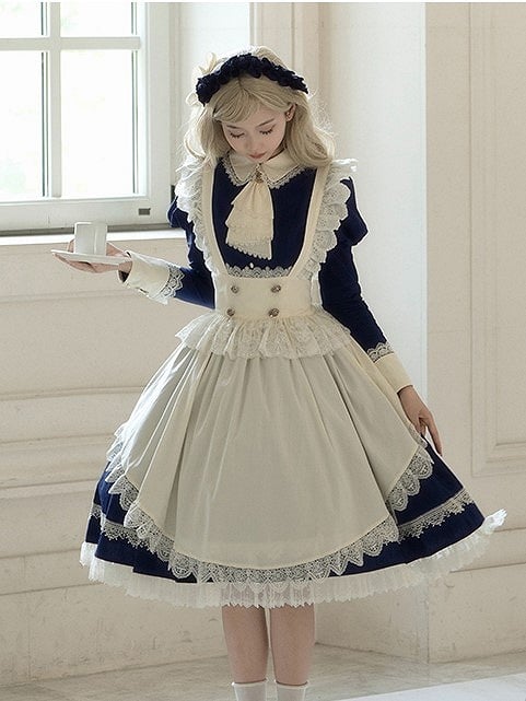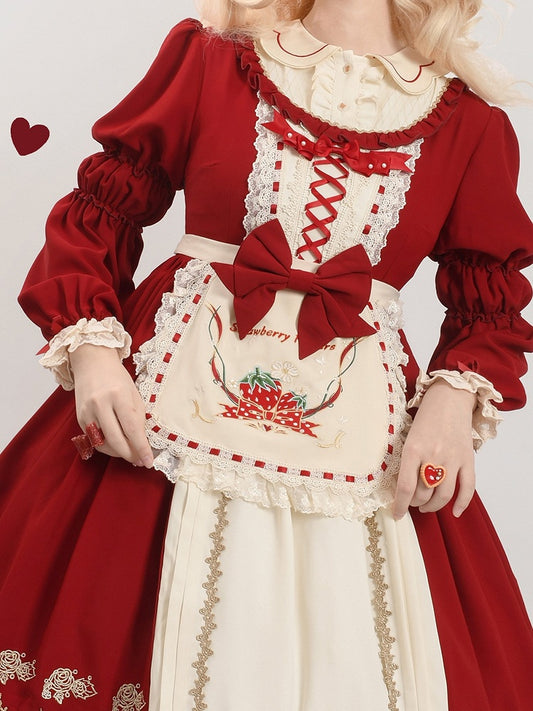 with Long-sleeved and Sweet Hem Red Apron Ruffle Beige Strawberry Embroidered Lolita Dress