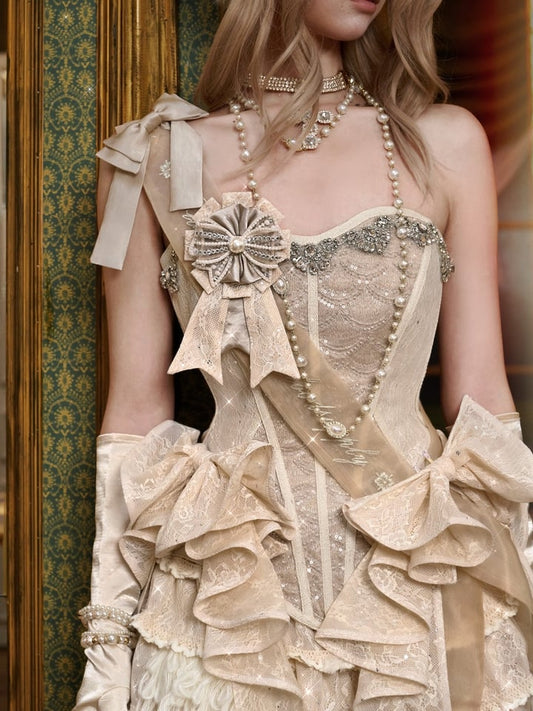 Cream with White Bow Corset Accents Knitted Lace Fuzzy
