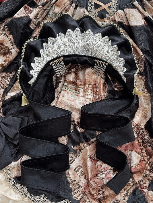 Wine Velvet Red/Black + Matte Bonnet 4 Bowknot Brooches Trim Lace