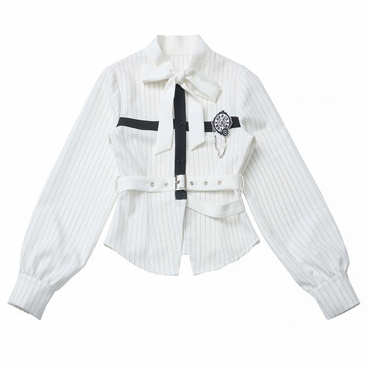 Shirt with Detachable Butterfly Clock Brooch Bow Black Self-tie White Stripes Cross Design