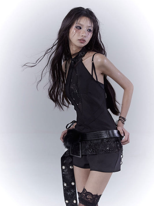 Belt Glamorous Black Halter Neck Spider Rhinestones Jumpsuit with Buckle