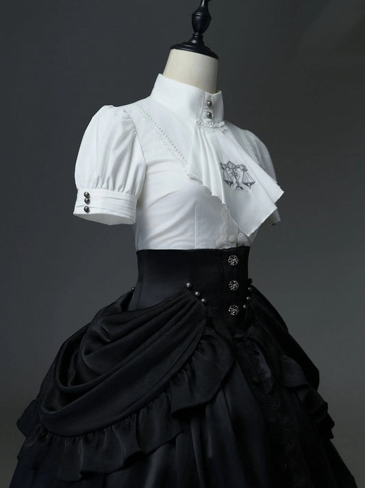 Shirt Sleeves High Pin Neck Jabot and Bow White with Detachable Short