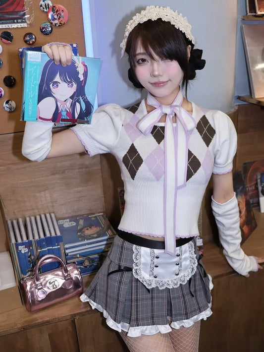 Gray Plaid Ruffled Trim Apron Design Mini Skirt
