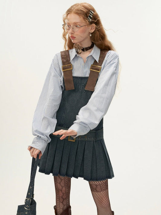 Leather Belted Logo Pleated Denim Suspender Skirt