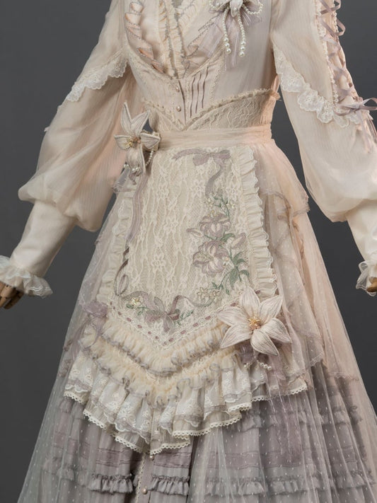 Beige Harp Embroidery Spring Semi-sheer Long Sleeves Elegant Classic Lolita Dress