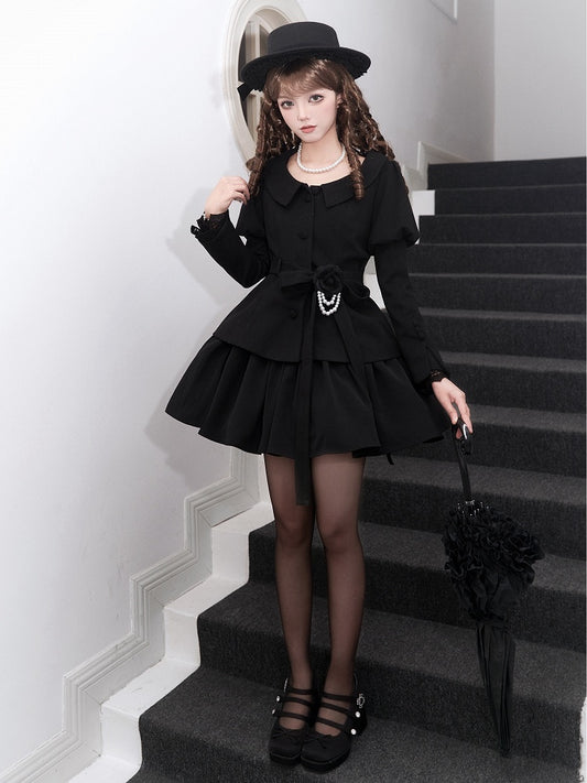 Gothic Lolita Full Set - Black Swallow Tail Long Sleeves Top + Gray Tiered Skirt + Red Jabot Brooch