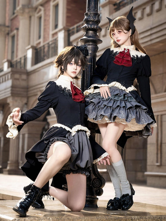 Vampire Prince Ouji Lolita Full Set - Black Swallow Tail Long Sleeves Top + Gray Bloomers Shorts + Red Jabot Brooch