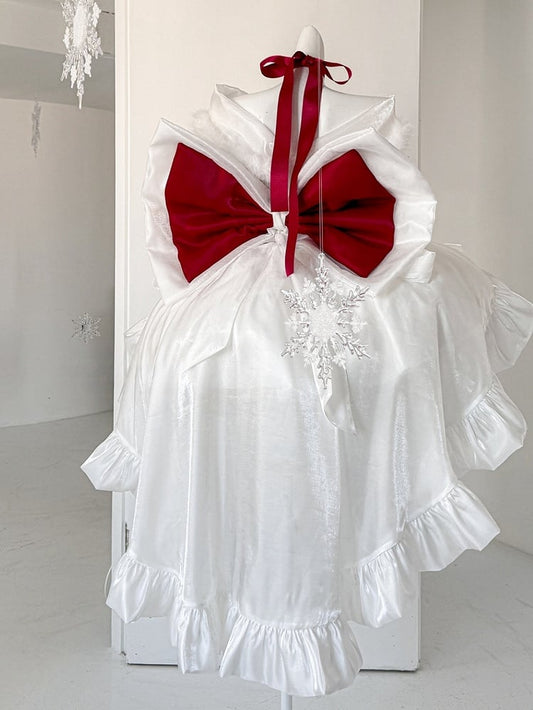 Snowy White Christmas Dress Red Bows Adorned Basque Waist Dress with Big Bow Cascading Train