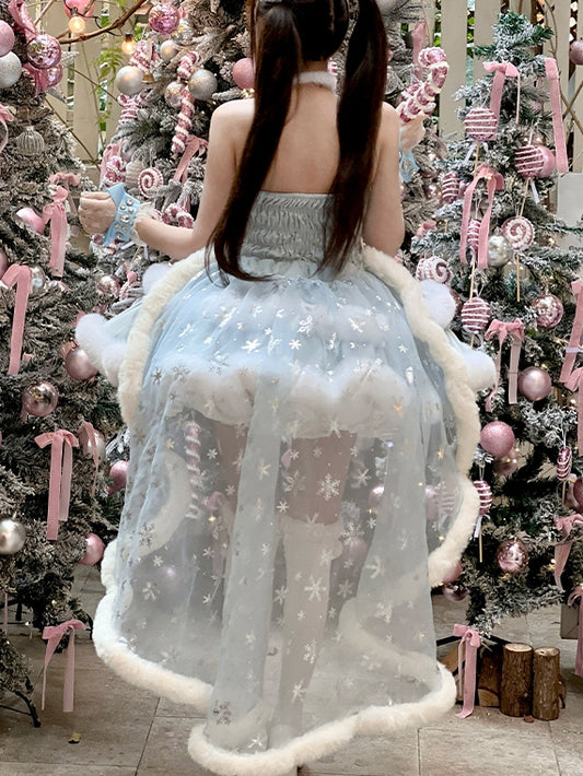 Blue and White Porcelain Strapless Corset Dress + Plush Trimming Hooded Cape