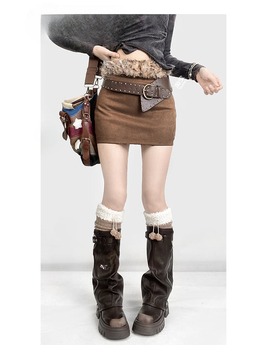 Coffee Shaggy Waistline Skirt with Buckle Belt