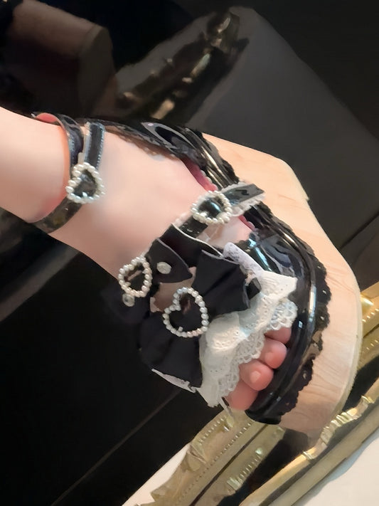 Beaded - Sandals Black Platform Showa-style Buckles Wedge Heart