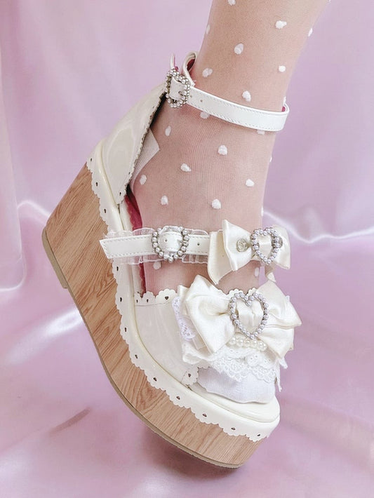 Heart Gyaru Beaded - Bow Wedge Pink Accents Platform Buckles Hime Sandals