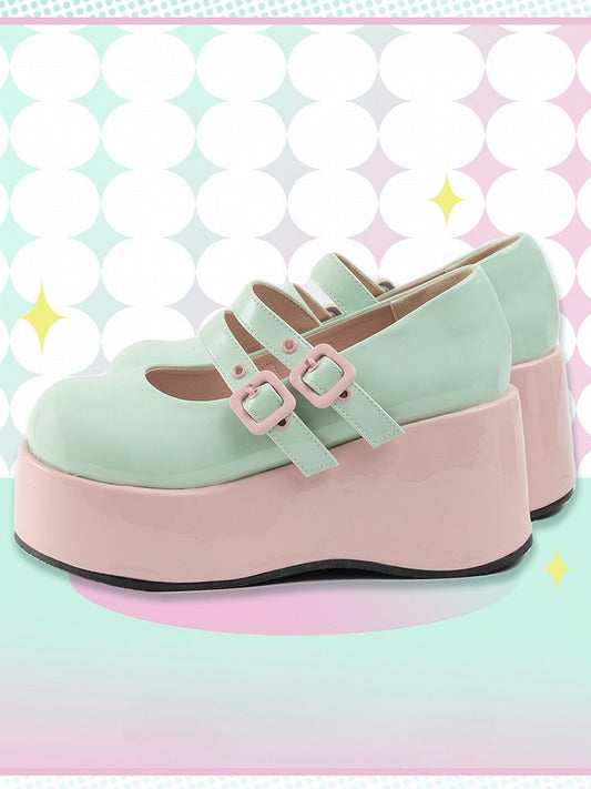 Leather PU Buckles Sweet Pink Lolita Green Sole Platforms with Wedge