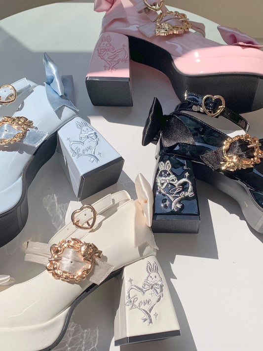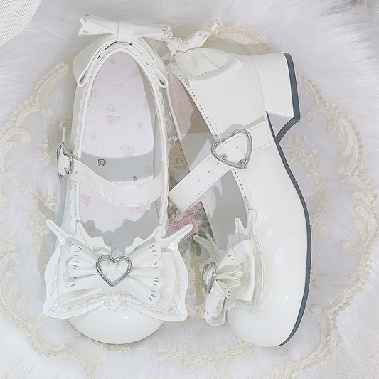 Sweet Lolita Milk White Bowknot Heart Buckle Strap Block Heel Mary Janes