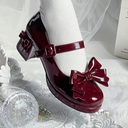 Wine Red Bowknot Buckle Strap Block Heel Lolita Mary Janes