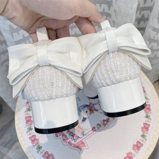 White Lolita Lace Bowknot Fork Embroidery Platform Block High Heels