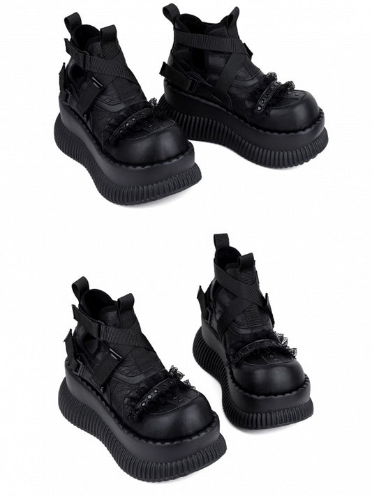 Shoes Stud Black Crisscross - Lace Platform Straps with Rock Details Punk Velcro Trim