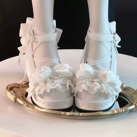 Platform Mary Block with Straps Crisscross - Janes Heel Buckle High Sweet Lolita White Heart Beaded