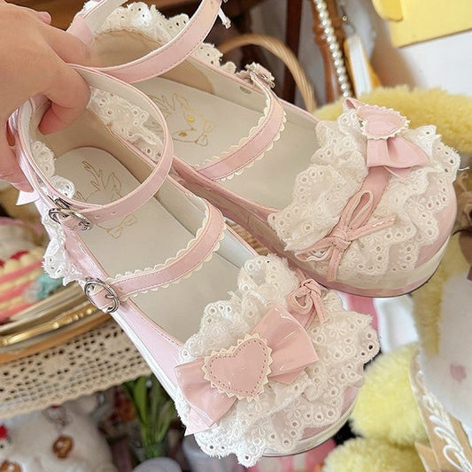 Lace Decor Heart - Sweet Lolita PU Trim Pink Platforms Bow Top