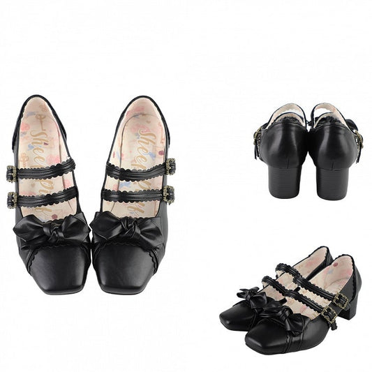 Lolita - Buckle Bow Details Jane Low Lace Shoes Heart-Shaped Mary with and Blue Heel Sweet