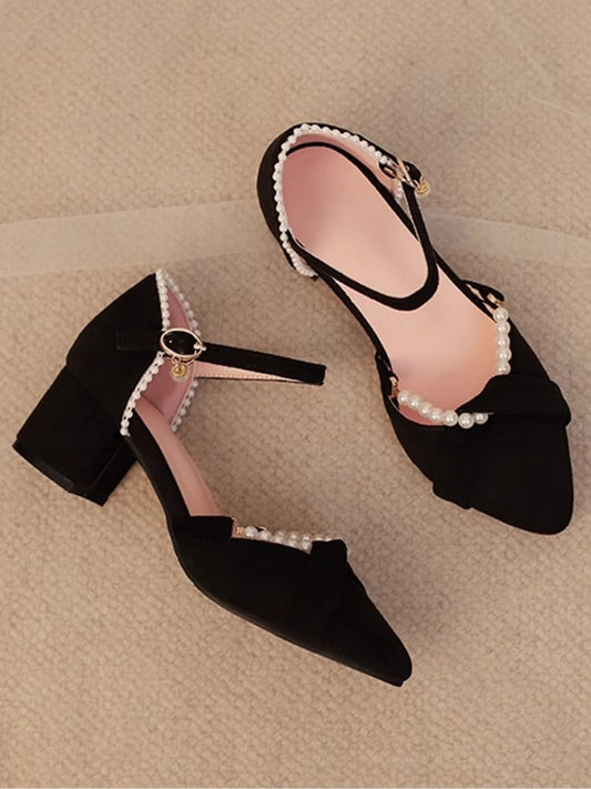 Decor Chain Shoes Intricate Qi Pointed with Toe Black - Heel Mid Beaded Sandals Lolita Detachable Back Suede