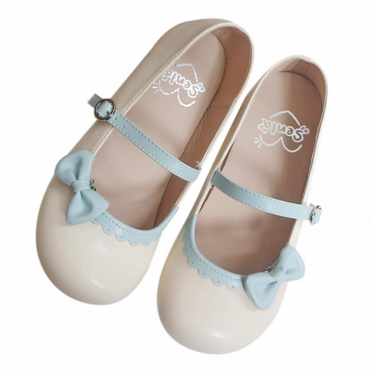Flat Hem Bow Round - Shoes Lolita Toe with Scalloped Beige Blue